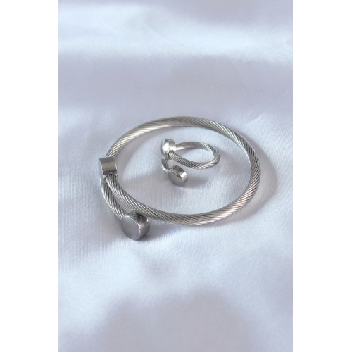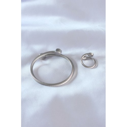 Çelik Gümüş Renk Sıkı Burgu Model Erkek Bileklik Yüzük Seti