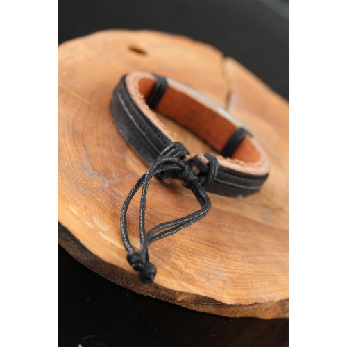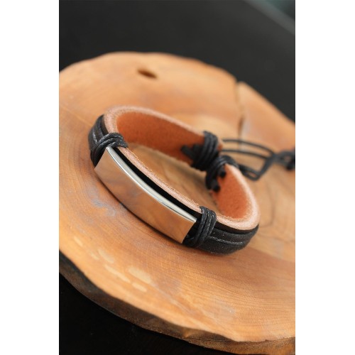 Çelik Aksesuarlı Siyah Renk Deri Erkek Bileklik