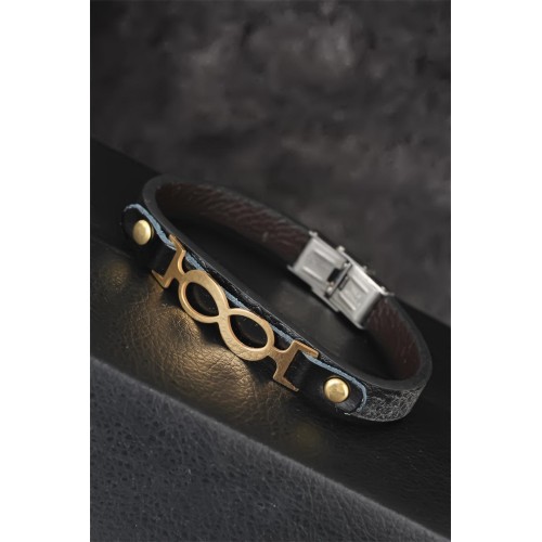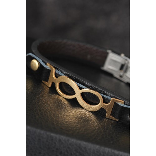 Gold Renk Sonsuzluk Figürlü Çelik Aksesuarlı Siyah Deri Erkek Bileklik