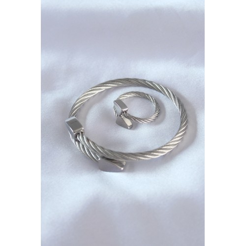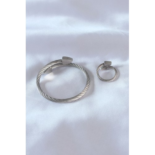 Çelik Gümüş Renk Burgu Model Erkek Bileklik Yüzük Seti