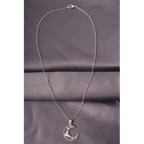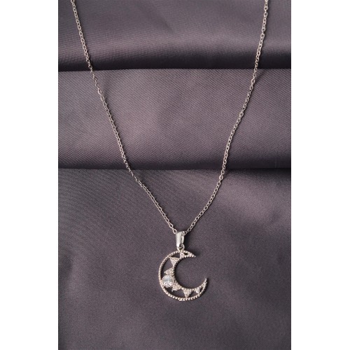 Gümüş Renk Metal Zirkon Taşlı Ay Model Kadın Kolye