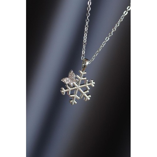 Gümüş Metal Kelebek Detaylı Kar Tanesi Figürlü Zirkon Taşlı Kadın Kolye