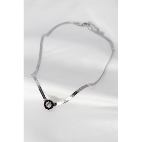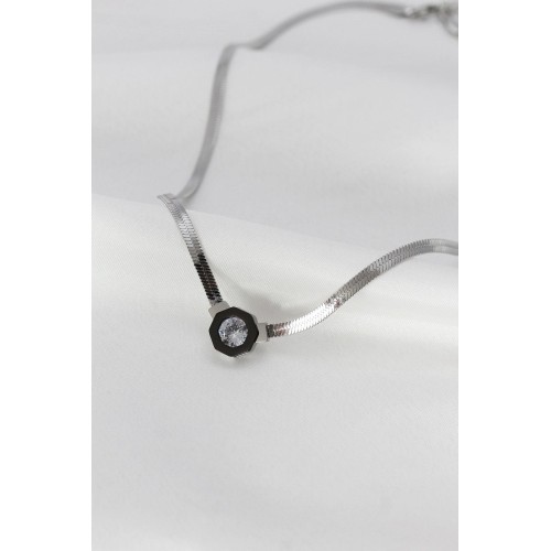 Çelik Gümüş Renk Siyah Mineli Zirkon Taşlı İtalyan Zincir Kolye