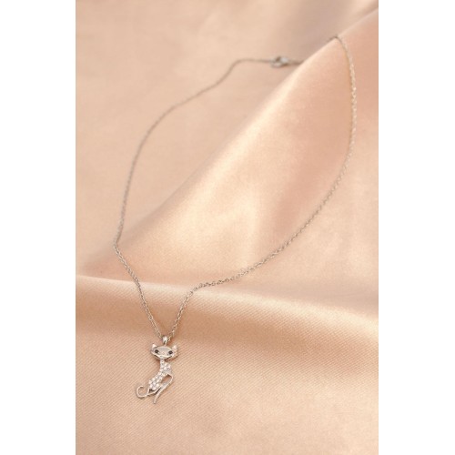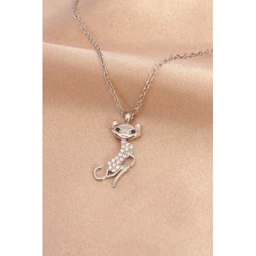 Gümüş Renk Metal Zirkon Taşlı Kedi Kolye