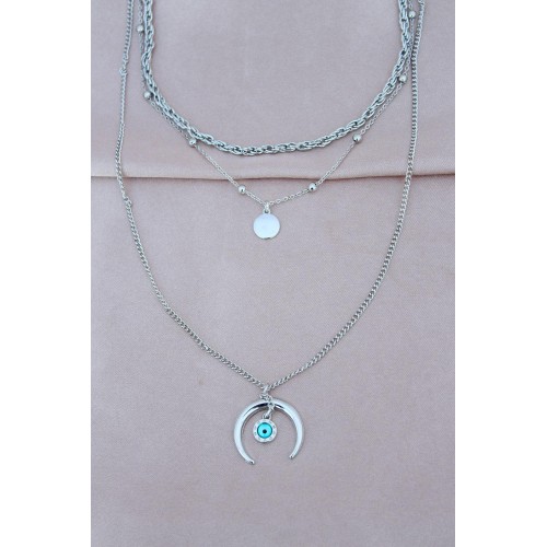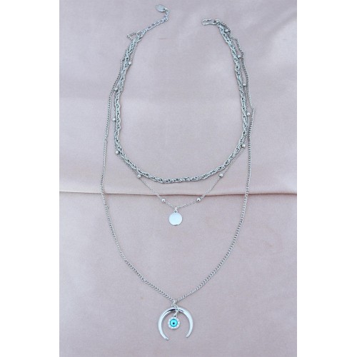 Gümüş Renk Metal Nazar Boncuk Detaylı Çoklu Kolye