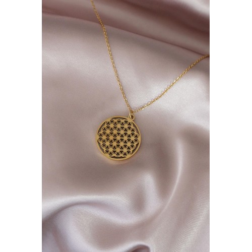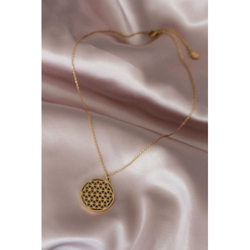 Çelik Yaşam Çiçeği Tasarımlı Gold Renk Kadın Kolye