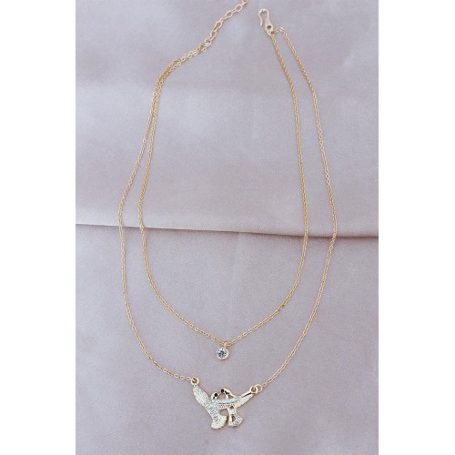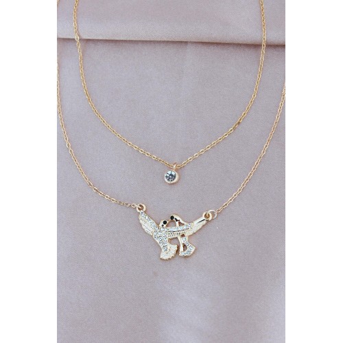 Gold Renk Metal Çift Zincirli Zirkon Taşlı Güvercin Kolye