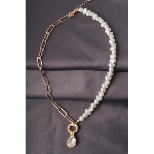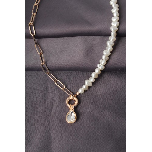 Gold Renk Metal Zirkon Taşlı Kalpli İnci Model Kadın Kolye