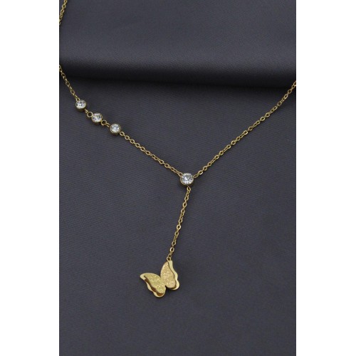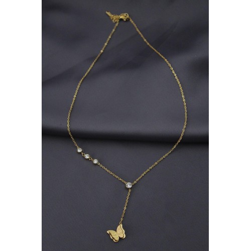 Çelik Gold Renk Zirkon Taşlı Simli Kelebek Tasarımlı Kadın Kolye