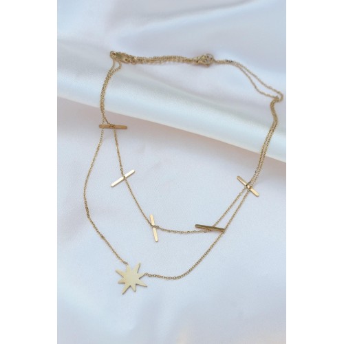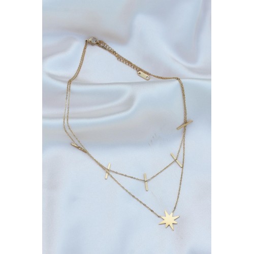 Çelik Gold Renk Çift Zincir Kutup Yıldızı Kolye