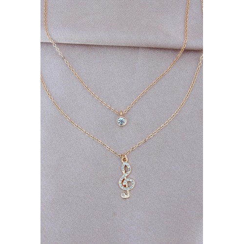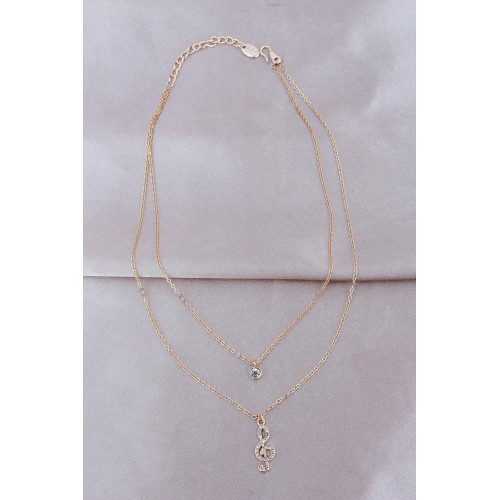 Gold Renk Metal Çift Zincirli Zirkon Taşlı Sol Anahtarı Kolye