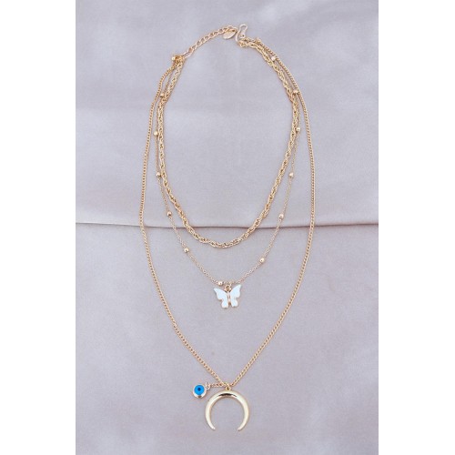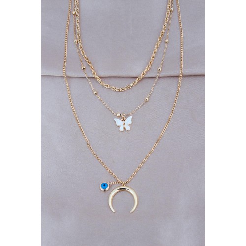 Çoklu Zincir Model Gold Renk Metal Nazar Boncuk Detaylı Sedefli Kelebek Kolye