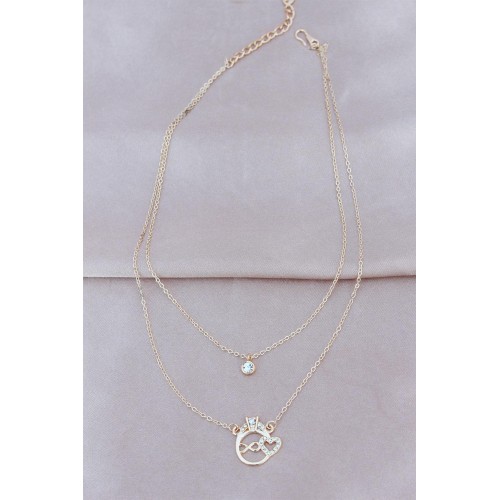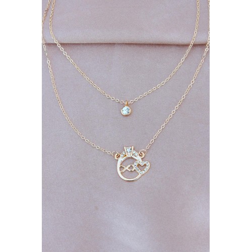 Altın Renk Metal Çift Zincirli Zirkon Taşlı Tektaş Kolye