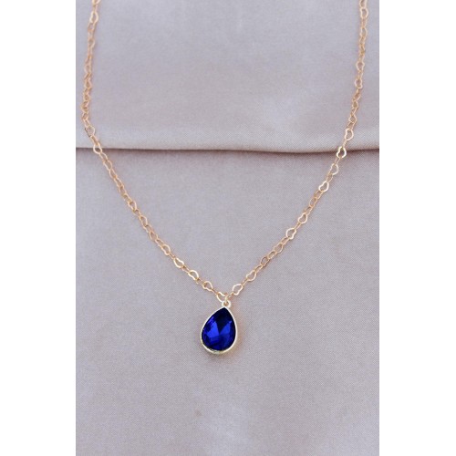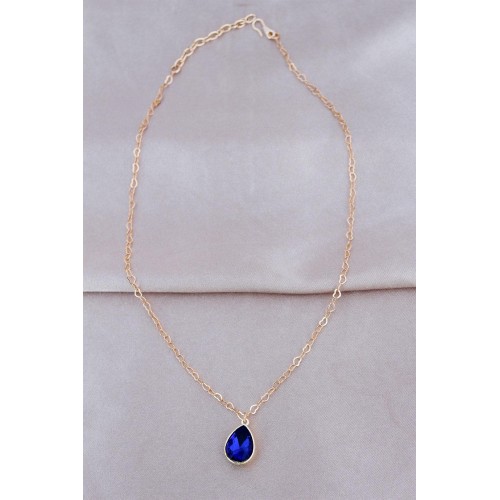 Altın Renk Metal Zincirli Mavi Kristal Taşlı Kolye