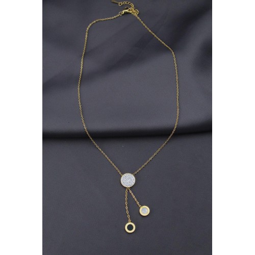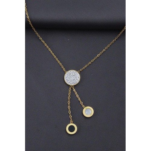 Çelik Gold Renk Zirkon Taşlı Oval Tasarımlı Sedefli Kadın Kolye