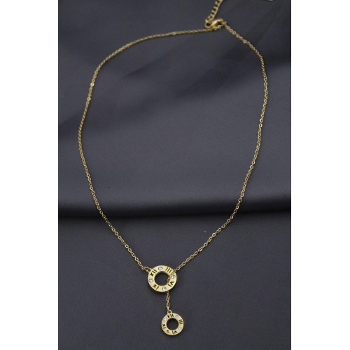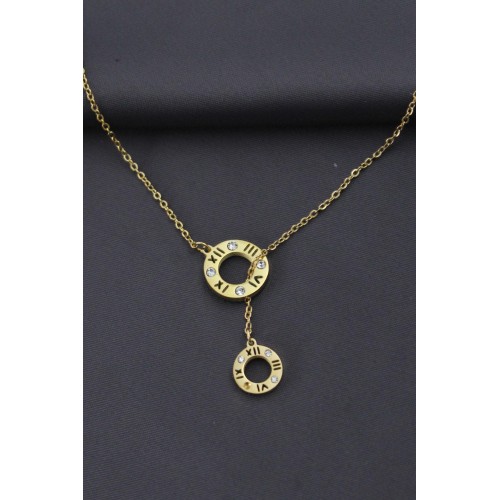 Çelik Gold Renk Zirkon Taşlı Roma Rakamlı Oval Tasarımlı Kadın Kolye