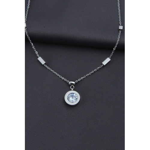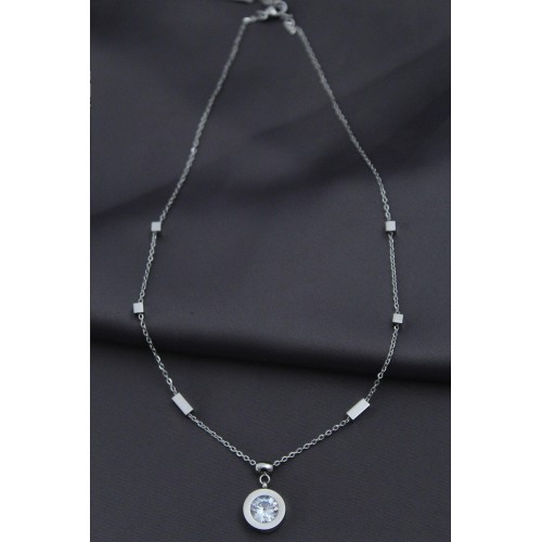 Çelik Silver Renk Kristal Taşlı Oval Tasarımlı Kadın Kolye