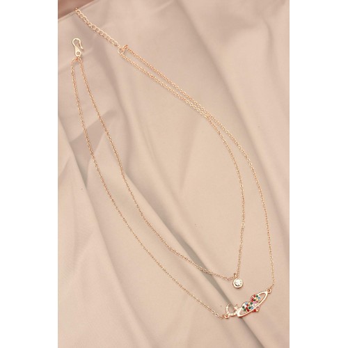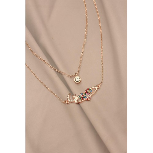 Ay Yıldızlı Model Renkli Zirkon Taşlı Rose Metal Kadın Kolye