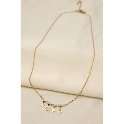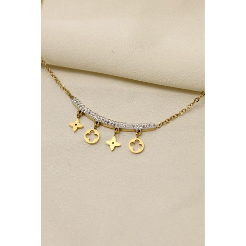 Çelik Gold Renk Zirkon Taşlı Minimal Yonca Tasarımlı Kadın Kolye