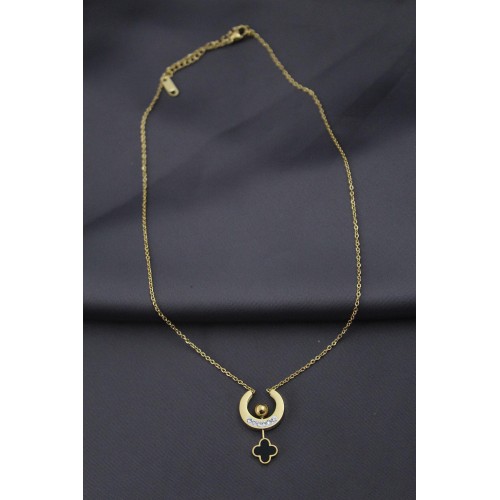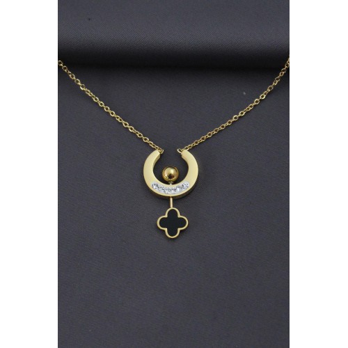 Çelik Altın Renk Zirkon Taşlı Mineli Yonca Tasarımlı Kadın Kolye